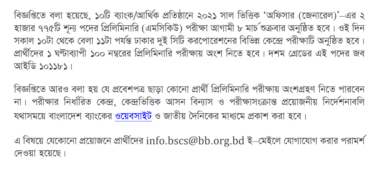 The date and schedule of the preliminary examination for 2775 vacant posts of 'Officer (General)' for the year 2021 in 10 Banks/Financial Institutions members of the Bankers Selection Committee have been published. The schedule was published in a circular given on the recruitment website of Bangladesh Bank.